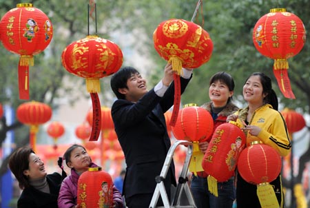 2月8日,合肥市綠苑社區(qū)居民懸掛寫有節(jié)日祝福的燈籠。當(dāng)日,安徽省合肥市綠苑社區(qū)群眾齊聚一堂,人們用寫有節(jié)日祝福語的元宵燈籠裝點(diǎn)社區(qū),有才藝的居民還在社區(qū)元宵喜樂會(huì)上表演節(jié)目,共迎元宵佳節(jié)。