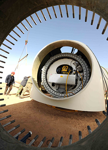 2月8日,施工人員正在內(nèi)蒙古巴彥淖爾市烏拉特后旗烏力吉風(fēng)電場吊裝風(fēng)機(jī)。擁有得天獨厚風(fēng)能資源的內(nèi)蒙古自治區(qū)按照國家發(fā)展新型潔凈能源的產(chǎn)業(yè)政策,加快環(huán)京津大型風(fēng)力發(fā)電基地建設(shè),200多家風(fēng)電企業(yè)在內(nèi)蒙古追風(fēng)逐電“搶灘登陸”。截至2009年初,全區(qū)風(fēng)電裝機(jī)容量突破300萬千瓦。 | |
