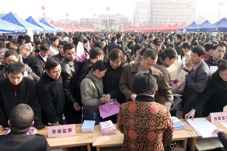 2月10日,返鄉(xiāng)農(nóng)民工在湖北襄樊樊城人民廣場(chǎng)舉行的送崗位、送培訓(xùn)、送信息、送信心“四送”活動(dòng)現(xiàn)場(chǎng)進(jìn)行就業(yè)咨詢。