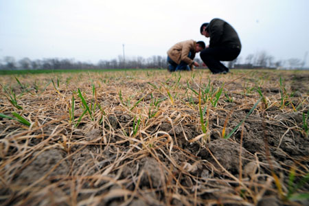 安徽省阜陽市插花鎮(zhèn)一處干旱的麥田里旱情嚴(yán)重。截至2月11日,河南、安徽、山東、河北、山西、陜西、甘肅、江蘇等主產(chǎn)區(qū)麥田受旱面積比高峰時(shí)下降了近四分之一,但目前仍有近40%的小麥?zhǔn)芎,抗旱形勢依然十分?yán)峻。