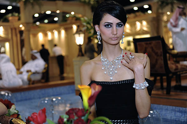 17日,一名模特展示今年流行款式的珍珠飾品。當(dāng)日,為期六天的第六屆多哈珠寶鐘表展在卡塔爾首都多哈的國際展覽中心開幕。據(jù)悉,此次參展的珠寶和鐘表總價(jià)值約20億美元。