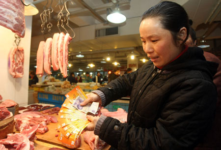 2月18日,在杭州市仙林苑農(nóng)貿(mào)市場(chǎng),一位市民準(zhǔn)備用剛領(lǐng)到的農(nóng)貿(mào)市場(chǎng)消費(fèi)券購買豬肉。當(dāng)日,杭州市下城區(qū)部分困難家庭領(lǐng)到了社區(qū)附近農(nóng)貿(mào)市場(chǎng)發(fā)放的專用消費(fèi)券,持券家庭可在指定農(nóng)貿(mào)市場(chǎng)內(nèi)購買糧、油、菜等。1月底,杭州市部分農(nóng)貿(mào)市場(chǎng)率先發(fā)放農(nóng)貿(mào)市場(chǎng)專用消費(fèi)券,惠及杭州市、區(qū)兩級(jí)低保、困難家庭。從2月18日開始的第二批消費(fèi)券發(fā)放活動(dòng),參與這項(xiàng)活動(dòng)的農(nóng)貿(mào)市場(chǎng)和受惠家庭范圍都有所擴(kuò)大。 |