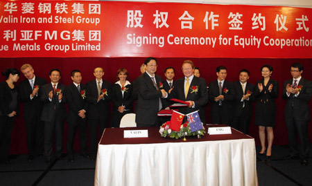 2月24日,華菱集團董事長李效偉(前左)和FMG集團CEO安德魯·弗里斯特(前右)在簽署股權(quán)合作協(xié)議后握手。當日,湖南華菱鋼鐵集團與澳大利亞第三大礦業(yè)公司FMG在香港簽署股權(quán)合作協(xié)議,華菱集團將以現(xiàn)金收購FMG發(fā)行的16.48%股份。據(jù)悉,本次交易尚需要獲得中國及澳大利亞相關(guān)監(jiān)管機構(gòu)的批準,如一切順利華菱集團將成為FMG第二大股東。