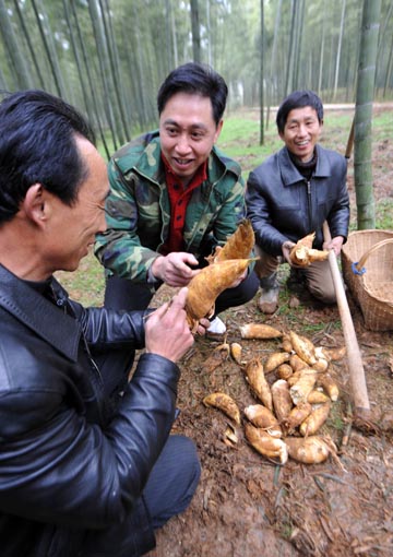 2月24日,陳永華(中)與當(dāng)?shù)剞r(nóng)民一道在竹林中挖采竹筍。 曾在南開大學(xué)獲得世界經(jīng)濟(jì)學(xué)博士學(xué)位的陳永華,2005年放棄在天津市一家證券公司總監(jiān)的職位,回到家鄉(xiāng)安徽省廣德縣投身現(xiàn)代農(nóng)業(yè),創(chuàng)辦了潤(rùn)華生態(tài)林業(yè)公司,建成了1.5萬畝優(yōu)質(zhì)高效豐產(chǎn)竹林。陳永華組織林農(nóng)在竹林間栽培竹蓀、套種山芋、套養(yǎng)竹林雞、投建竹筍加工廠,發(fā)展竹林經(jīng)濟(jì),為當(dāng)?shù)剞r(nóng)民提供固定就業(yè)崗位150個(gè),季節(jié)性用工最多時(shí)每天達(dá)到上千人,每年為農(nóng)民提供山場(chǎng)租賃費(fèi)和勞務(wù)收入1000萬元。 |