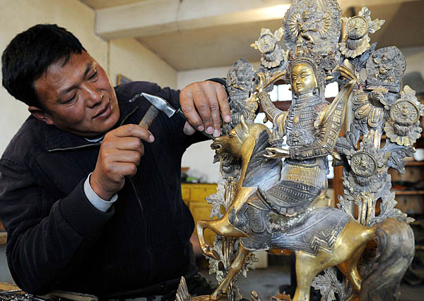 云南省迪慶藏族自治州德欽縣升平鎮(zhèn)藏族手工藝人、獲得“云南省工藝美術(shù)大師”稱號的洛桑扎西在制作銅制工藝品。近年來,地處云南省西北部的迪慶藏族自治州大力發(fā)展具有民族特色的手工藝制作業(yè),將唐卡、銅雕、藏飾等特色產(chǎn)品推向市場。如今在一些鄉(xiāng)鎮(zhèn)已形成“家家有手藝,戶戶是工廠”的格局。