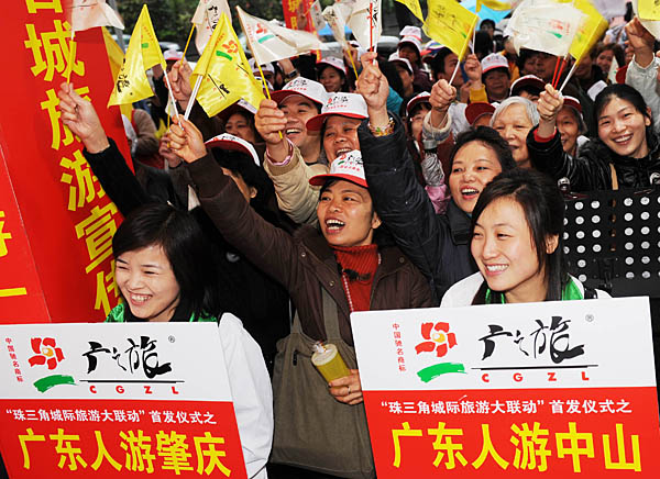 廣東“國民旅游休閑計(jì)劃”實(shí)施以來規(guī)模最大的城際旅游合作項(xiàng)目——“珠三角城際旅游大聯(lián)動”日前在廣州啟動,2000名廣州游客分赴佛山、肇慶、江門等8市旅游。主辦單位廣東省旅游局表示,要充分調(diào)動珠三角地區(qū)豐富的旅游資源和客源資源,以拉動內(nèi)需、邁出珠三角地區(qū)“旅游一體化”試驗(yàn)的第一步。圖為即將出發(fā)的廣州游客在“珠三角城際旅游大聯(lián)動”啟動儀式上。