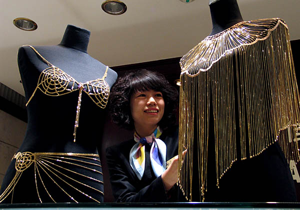 3月10日,濟(jì)南一家金店展出用18K黃金打造的披肩和內(nèi)衣。