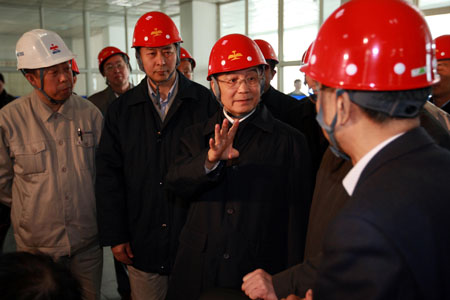 這是3月20日,溫家寶在鞍山鋼鐵集團(tuán)公司同企業(yè)負(fù)責(zé)人商談應(yīng)對金融危機(jī)的對策。 3月20日至22日,溫家寶在鞍山、沈陽、大連等地調(diào)研。3月20日下午,溫家寶在特變電工沈陽變壓器集團(tuán)生產(chǎn)車間內(nèi),企業(yè)負(fù)責(zé)人張新告訴總理,面對金融危機(jī),企業(yè)不減產(chǎn)反增產(chǎn),不裁員反增員,不減薪反加薪,不減利稅反增利稅,預(yù)計(jì)今年銷售能增長50%以上。溫家寶聽后十分高興,他說:“沒有想到這家企業(yè)情況這么好。我現(xiàn)在最關(guān)心企業(yè)四件事情:生產(chǎn)、裁員、減薪、稅收,你們都創(chuàng)造了奇跡。雖然遇到國際金融危機(jī)的‘寒冬’,這里還是溫暖的。” |