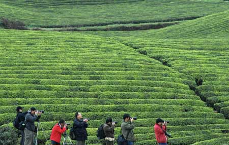 3月28日,攝影愛(ài)好者在湄潭縣拍攝“茶海”風(fēng)光。貴州省湄潭縣是黔北地區(qū)最大的茶葉生產(chǎn)基地,有茶園約20萬(wàn)畝,被譽(yù)為“西部茶鄉(xiāng)”,當(dāng)?shù)氐牟鑸@連片發(fā)展,形成了蔚為壯觀的“茶!,成為鄉(xiāng)村生態(tài)旅游的“名片”。