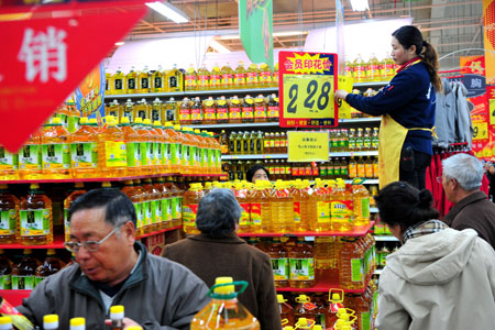 3月30日,一名超市工作人員正在調(diào)整食用油價簽。 近日,青島市食用油市場開始大規(guī)模降價銷售。此次降價幾乎涉及所有的食用油種類,平均降價幅度在30%左右,最大降價幅度接近50%。據(jù)業(yè)內(nèi)人士分析,此次降價是受到銷售市場冷清及原料價格下滑等多種因素影響,價格可能在4月份趨于穩(wěn)定,5月份開始小幅回升。