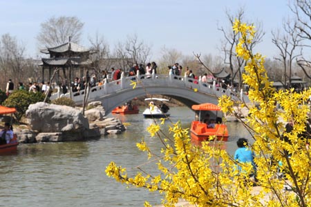 4月6日,在天津長虹公園,小橋流水的美景吸引了眾多游人。當日,天津最高氣溫達26攝氏度,市民紛紛來到戶外享受春色。新華社記者:馬平 攝