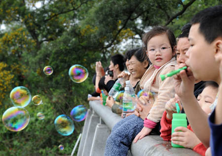 4月6日,市民們在白云山頂?shù)挠^景臺上觀賞游玩。4月4日到6日,廣州的許多市民來到白云山、云臺花園等風景秀麗、空氣清新的郊外去野營、遠足和踏青,以此方式來度過三天長假。新華社記者:周文杰