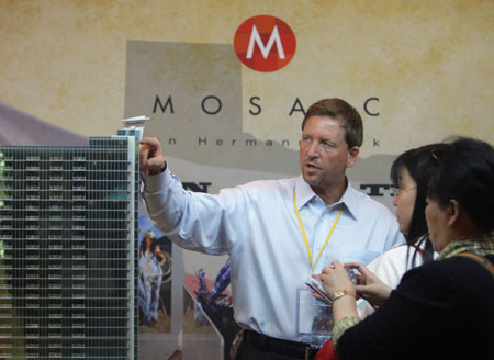 4月12日,來(lái)自美國(guó)馬賽克公司的經(jīng)銷總經(jīng)理托馬斯(左)在向中國(guó)消費(fèi)者介紹他們的房子。4月10日至12日,美中房地產(chǎn)展示交易會(huì)在北京召開(kāi),該交易會(huì)由美中貿(mào)易發(fā)展協(xié)會(huì)等單位組織,70多家美國(guó)開(kāi)發(fā)商和中介機(jī)構(gòu)參加交易會(huì)。據(jù)主辦方預(yù)計(jì)在3天時(shí)間內(nèi),會(huì)有500多套住宅意向成交。 |