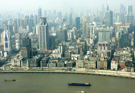 上海黃浦江邊的外灘金融街鳥瞰(3月25日攝)。 上海市商務委員會4月11日發(fā)布的信息顯示,雖然遭遇金融危機,但2009年一季度上海外向型經(jīng)濟發(fā)展好于預期,實到外資23.2億美元,比2008年同期增長2.3%,總體情況略好于周邊地區(qū)及全國平均水平。