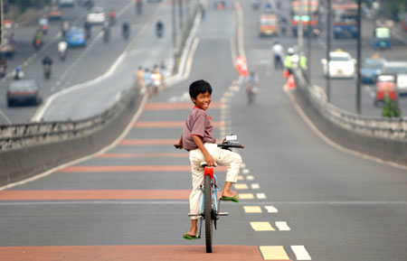 Suprapto)大街上,一名男孩在寬闊的道路上騎自行車。 當(dāng)天,雅加達(dá)政府新增加的蘇拉多將軍(Letjen