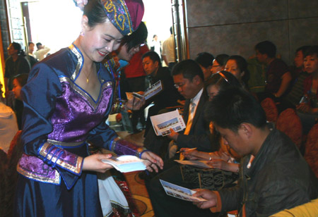 4月13日,內(nèi)蒙古希拉穆仁天堂草原旅游景區(qū)工作人員在向旅行社代表發(fā)放旅游消費(fèi)券。隨著旅游旺季的到來,內(nèi)蒙古相繼出臺一系列旅游景區(qū)、酒店優(yōu)惠政策,開展向社會團(tuán)體和市民發(fā)放免費(fèi)門票、旅游券活動,積極鼓勵引導(dǎo)旅游消費(fèi)。
