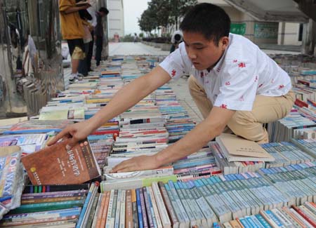 4月13日,杜衛(wèi)彬正在整理回收來的書籍。 西南政法大學大四學生杜衛(wèi)彬來自新疆農(nóng)村,他從大一開始帶著一些同學辦起校園“綠色回收站”,專門回收同學們不要的書籍和舊物品,然后經(jīng)過分類整理后再折價賣給需要的同學。3年多來,先后有近千名貧困同學在“綠色回收站”勤工儉學,回收的舊書超過百噸。