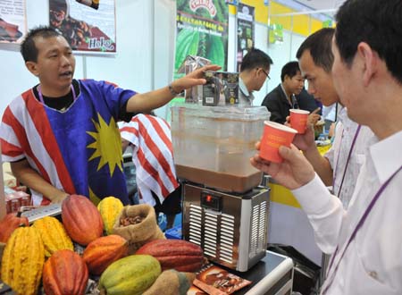 4月16日,一位馬來西亞的企業(yè)代表(左)在第105屆廣交會(huì)進(jìn)口展區(qū)推銷可可制品。第105屆廣交會(huì)4月15日在廣州琶洲廣交會(huì)展館開幕,進(jìn)口展區(qū)來自36個(gè)國(guó)家和地區(qū)的395家企業(yè)利用廣交會(huì)這個(gè)商貿(mào)平臺(tái),展示、推介產(chǎn)品。