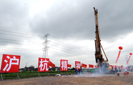 4月20日,在浙江嘉興市大橋村步云特大橋工地上,旋挖鉆機開鉆滬杭鐵路客運專線全線第一樁樁孔。滬杭鐵路客運專線是國家鐵路“十一五”規(guī)劃中滬杭甬客運專線的一部分,由上海虹橋站至杭州東站,線路長158.5公里,設(shè)計時速每小時350公里,項目投資總額為276.3億元。預計2010年國慶通車,屆時上海至杭州可在40分鐘內(nèi)到達。
