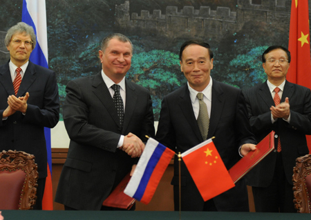 4月21日,國(guó)務(wù)院副總理王岐山在北京人民大會(huì)堂同俄羅斯副總理謝欽舉行中俄能源談判代表第四次會(huì)晤,共同簽署了《中俄石油領(lǐng)域合作政府間協(xié)議》,雙方管道建設(shè)、原油貿(mào)易、貸款等一攬子合作協(xié)議隨即生效。