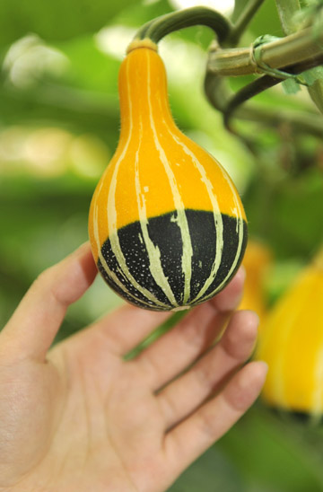 第十屆中國(壽光)國際蔬菜科技博覽會日前在的山東壽光舉行。本屆菜博會共展出2000多個蔬菜、果品、花卉品種,300多項新技術(shù)。近年來,有“中國蔬菜之鄉(xiāng)”美譽的壽光大力發(fā)展特色生態(tài)蔬菜生產(chǎn),建起國內(nèi)首個觀賞型蔬菜博覽園,使壽光蔬菜走向食用與觀賞并重的時代,成為名副其實的中國“菜籃子”。圖為博覽會上展出的“多彩南瓜”