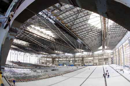 4月26日,施工人員在上海世博會(huì)主題館西展廳進(jìn)行內(nèi)部裝飾施工。目前,上海世博會(huì)主題館西展廳建成,進(jìn)入到內(nèi)部裝飾施工階段。世博會(huì)主題館西展廳南北跨180米,東西跨126米,矩形的超大跨度無柱空間創(chuàng)國(guó)內(nèi)之最。