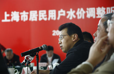 4月27日,一名與會者在聽證會上發(fā)言。當日,上海市社會發(fā)展委員會舉行居民用戶水價調整聽證會,就兩套調價方案征求社會各方意見,這是上海時隔7年再次針對居民生活用水價格調整進行聽證。目前上海自來水綜合水價為每立方米1.84元,而全國36個大中城市綜合水價的平均值為3.77元。