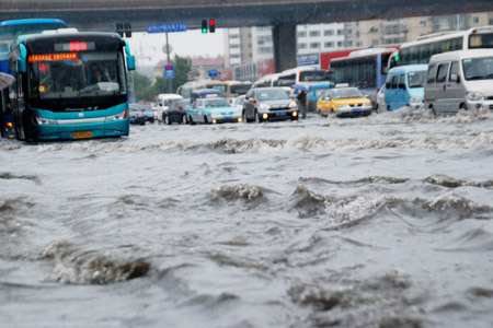 5月10日,在山東濟(jì)南市長途汽車站附近街頭,車輛在積水中行進(jìn)。5月9日下午至10日上午,山東濟(jì)南普降大到暴雨,市區(qū)平均降雨量達(dá)135毫米,不少低洼路段積水嚴(yán)重。濟(jì)南氣象臺(tái)已發(fā)布暴雨紅色預(yù)警信號(hào),提醒公眾加強(qiáng)防范。