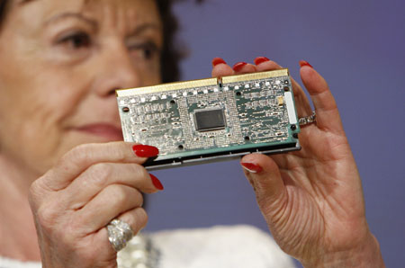 圖為內(nèi)莉·克勒斯-斯米特在比利時(shí)布魯塞爾舉行的新聞發(fā)布會(huì)上展示一塊電腦芯片。 |