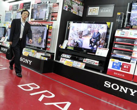 5月14日,在日本首都東京一家商場,一名男子走過索尼公司的液晶電視柜臺。日本索尼公司14日宣布,該公司在截至今年3月的2008財政年度凈虧損989億日元(約合10億美元)。這是該公司14年來首次虧損。