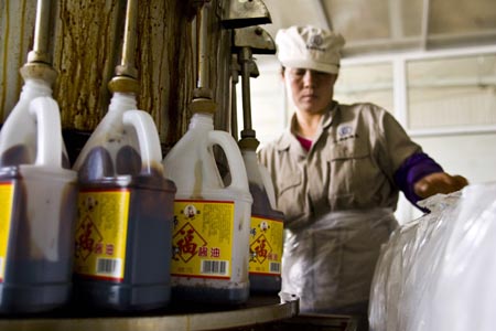 內(nèi)蒙古鄂爾多斯市是我國重要的沙棘產(chǎn)地,沙棘保存面積達(dá)300多萬畝,占全國沙棘總面積的70%,被譽(yù)為“中國沙棘之都”。隨著多家大型沙棘加工企業(yè)落戶鄂爾多斯東勝區(qū)的沙棘產(chǎn)業(yè)園生產(chǎn)食醋、醬油、飼料等產(chǎn)品,“沙棘產(chǎn)業(yè)鏈”使沙棘種植在發(fā)揮生態(tài)效益的同時(shí)也產(chǎn)生出很大的經(jīng)濟(jì)效益。每年四季,當(dāng)?shù)剞r(nóng)民可以從沙棘種植、管理、收獲等環(huán)節(jié)增加收入。圖為工人在內(nèi)蒙古鄂爾多斯市東勝區(qū)天驕沙棘食品有限公司醬油灌裝的車間工作。 |