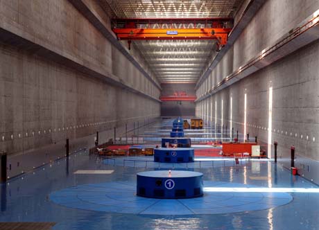 這是三峽電站左岸電廠內(nèi)景(5月21日攝)。 據(jù)介紹,至5月中旬,三峽電站連續(xù)安全穩(wěn)定運(yùn)行已超過(guò)1000天,標(biāo)志著我國(guó)大型水電站機(jī)組制造和運(yùn)行管理水平躍上新臺(tái)階。三峽電站初步設(shè)計(jì)共安裝26臺(tái)單機(jī)容量為70萬(wàn)千瓦的巨型發(fā)電機(jī)組,其中有8臺(tái)為國(guó)產(chǎn)化機(jī)組。目前,26臺(tái)機(jī)組已全部投產(chǎn)發(fā)電,使三峽電站的巨大效益得到充分發(fā)揮。 |