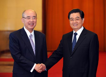 5月26日,中共中央總書記胡錦濤在北京人民大會堂會見中國國民黨主席吳伯雄和他率領(lǐng)的國民黨大陸訪問團全體成員,并同吳伯雄舉行會談。這是胡錦濤同吳伯雄親切握手。