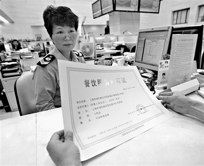 6月1日,上海市浦東新區(qū)食品藥品監(jiān)督管理部門的工作人員向經(jīng)營(yíng)者發(fā)放“餐飲服務(wù)許可證”。當(dāng)日,國(guó)家食品藥品監(jiān)督管理局在上海舉行“餐飲服務(wù)許可證”啟用發(fā)放儀式,7家通過審核的餐飲企業(yè)獲得了我國(guó)首批“餐飲服務(wù)許可證”。