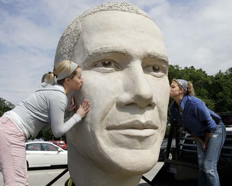 13日,在美國伊利諾伊州芝加哥,兩名游客親吻高度近2.5米的美國總統(tǒng)奧巴馬頭像雕塑。雕塑家大衛(wèi)·阿迪克斯計劃塑造一座高達6米的奧巴馬半身像,這座半身雕像將與其他42座美國前總統(tǒng)的塑像一起被擺放在位于南達科他的總統(tǒng)公園內(nèi)。