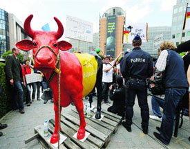 6月18日,在比利時(shí)首都布魯塞爾,奶農(nóng)在歐盟總部外示威。當(dāng)日,近千名來(lái)自德國(guó)、比利時(shí)等歐盟國(guó)家的奶農(nóng)聚集在歐盟總部外舉行示威游行,要求維護(hù)奶農(nóng)的利益,阻止牛奶收購(gòu)價(jià)格的進(jìn)一步下跌。