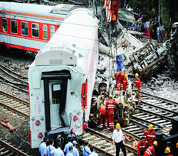 6月29日,救援人員正在現(xiàn)場(chǎng)奮力搶修。當(dāng)日凌晨,由長(zhǎng)沙開(kāi)往深圳的K9017次和銅仁開(kāi)往深圳西的K9063次列車在湘粵邊界湖南郴州火車站內(nèi)發(fā)生側(cè)面沖撞事故,事故造成3人死亡,60余人受傷。事故發(fā)生后,救援部門(mén)緊急調(diào)來(lái)了應(yīng)急發(fā)電、照明設(shè)備和切割機(jī)、大型千斤頂?shù)染仍O(shè)備,奮力搶修清理。經(jīng)過(guò)奮力搶修清理,7時(shí)06分,京廣線上行(北上)已恢復(fù)運(yùn)行,14時(shí)25分,京廣線下行(南下)恢復(fù)運(yùn)行。至此,京廣全線基本恢復(fù)正常行車。 |
