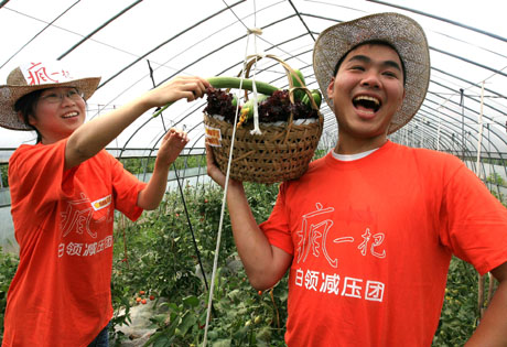 7月6日,在上海工作的張帥(右)和同伴喜收他們自己種植的蔬菜。 近期,不少上海的年輕人在郊區(qū)租種菜地,并在閑暇時(shí)結(jié)伴到郊外收獲自己的勞動(dòng)成果,這種休閑方式成為許多上班族平衡生活、釋放壓力的一種選擇。