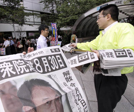 13日,一名日本男子在東京分發(fā)刊登舉行眾議院大選消息的報紙?zhí)乜。據日本媒體報道,日本首相麻生已同意下周解散眾議院,并在8月30日舉行大選。