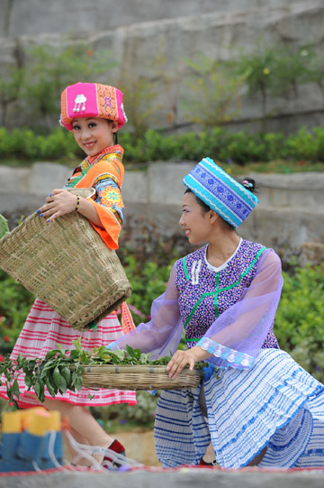 7月26日,兩名演員在“藥王谷之夏”活動現(xiàn)場表演采集藥材。 當日,由貴州清鎮(zhèn)市旅游局主辦的“藥王谷之夏”麥格生態(tài)民俗文化節(jié)系列活動在清鎮(zhèn)市麥格苗族布依族鄉(xiāng)正式啟動。在為期3天的活動中,主辦方將舉辦民族風情攝影展、“六月六”布依歌會、民族服飾展、自行車自駕游等11項活動。