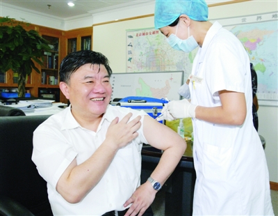 作為我國第一個(gè)甲型H1N1流感疫苗受試者,衛(wèi)生部部長陳竺8月11日下午接種第二針。(圖片來源:衛(wèi)生部網(wǎng)站)