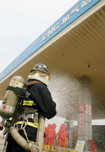 6月17日,安徽巢湖舉行“加氣站燃?xì)庑孤⿹岆U救援演練”,消防隊員用水對泄漏出來的燃?xì)膺M(jìn)行稀釋。 演練模擬加氣站內(nèi)加氣機(jī)排污閥突然泄漏,造成高壓天然氣外泄,巢湖市安監(jiān)局、消防支隊等多個單位參與“搶險救援”工作。