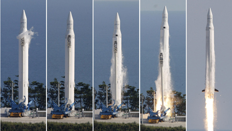 8月25日,在韓國(guó)南部的羅老宇航中心,韓國(guó)首枚運(yùn)載火箭“羅老”號(hào)發(fā)射升空(拼版照片)。韓國(guó)羅老宇航中心當(dāng)日宣布,“羅老”號(hào)運(yùn)載火箭應(yīng)于306公里高度進(jìn)行分離,但實(shí)際分離高度為342公里,二級(jí)火箭未進(jìn)入預(yù)定軌道,“屬于部分發(fā)射失敗”。 |