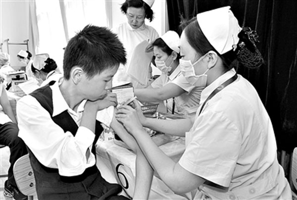 9月21日,京源學(xué)校的學(xué)生在接種甲型H1N1流感疫苗。 從當(dāng)日起,北京市在全國(guó)率先啟動(dòng)甲型H1N1流感疫苗接種工作,按照不同人群疫苗接種的優(yōu)先次序,北京市目前優(yōu)先對(duì)參與國(guó)慶慶典活動(dòng)的學(xué)生開(kāi)展接種。新華社發(fā)