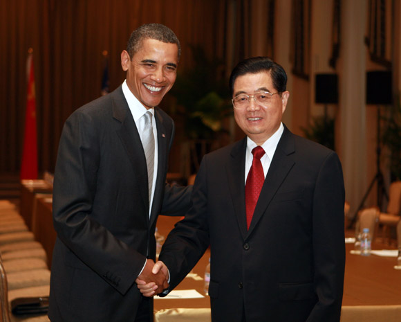 圖為9月22日,國家主席胡錦濤在紐約同美國總統(tǒng)奧巴馬舉行會晤。 胡錦濤表示,美方對中國輸美輪胎采取特保措施不符合兩國利益,類似事情不應該再次發(fā)生。在當前經(jīng)濟金融形勢下,中美雙方更應該堅定反對貿(mào)易和投資保護主義。