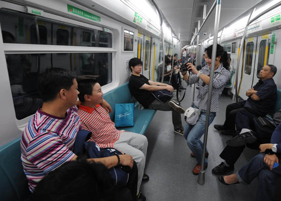 9月28日,乘客在地鐵四號(hào)線車廂內(nèi)拍照留念。 當(dāng)日,北京地鐵4號(hào)線開通試運(yùn)營(yíng)。北京地鐵4號(hào)線是繼地鐵5號(hào)線之后北京市另一條貫穿市區(qū)南北的軌道交通主干線,該線全長(zhǎng)28.2公里,設(shè)24座車站,沿線設(shè)換乘站9座。4號(hào)線的開通,使北京軌道交通運(yùn)營(yíng)里程接近230公里,車站達(dá)147座。