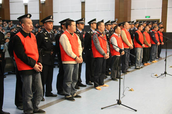 10月12日,楊天慶(左一)等被告人在庭審現場。 當日,重慶兩起“涉黑涉惡”案件分別在重慶市第一和第三中級人民法院開庭,31名被告人受審。其中重慶市第一中級人民法院公開開庭審理的是楊天慶等9人“涉黑”案,國家公訴機關指控的涉案罪名多達十項,涉嫌犯罪時間跨越八年。從當日起,重慶的“涉黑涉惡”案件將在五個中級法院陸續(xù)開庭審理。新華社發(fā)