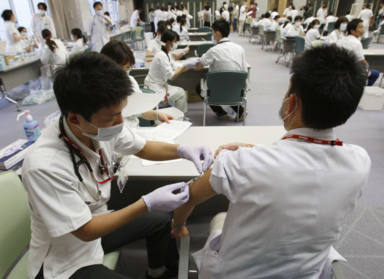 19日,在日本首都東京的一家醫(yī)院,醫(yī)務(wù)工作者接受甲型流感疫苗注射。當(dāng)日,日本開始甲型流感疫苗的接種工作,首批100多萬醫(yī)務(wù)工作者將接受日本國產(chǎn)疫苗注射。從11月開始,孕婦和患有某些慢性病的人群將接受注射。