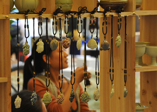 景德鎮(zhèn)樂天陶社主辦的創(chuàng)意集市目前成為大學生自主創(chuàng)業(yè)的一塊樂土。今年景德鎮(zhèn)國際陶瓷博覽會期間,樂天陶社于17日—21日舉辦專場活動,吸引了中外眾多愛好者駐足。日均成交額達七萬余元,為大學生自主創(chuàng)意提供了一個很好的商業(yè)平臺。圖為大學生自主創(chuàng)意的陶瓷首飾。