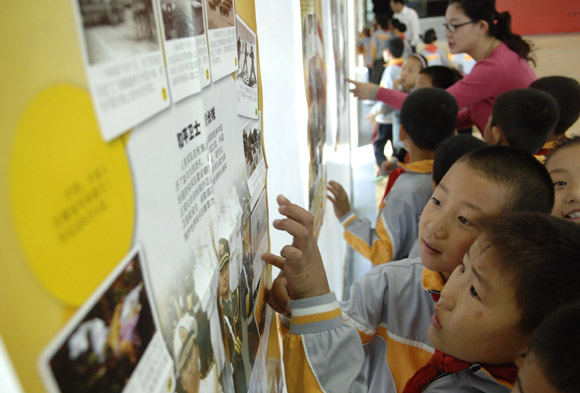 10月20日,安徽省“新中國60年教育掛圖走進中小學校園”活動啟動儀式在合肥師范附屬小學舉行。本次活動由新華社與教育部共同主辦,旨在通過圖片展示新中國60年的輝煌歷程,對中小學生進行愛國主義教育、革命傳統(tǒng)教育和中華民族傳統(tǒng)美德教育。圖為當日合肥師范附小的小學生在觀看掛圖。